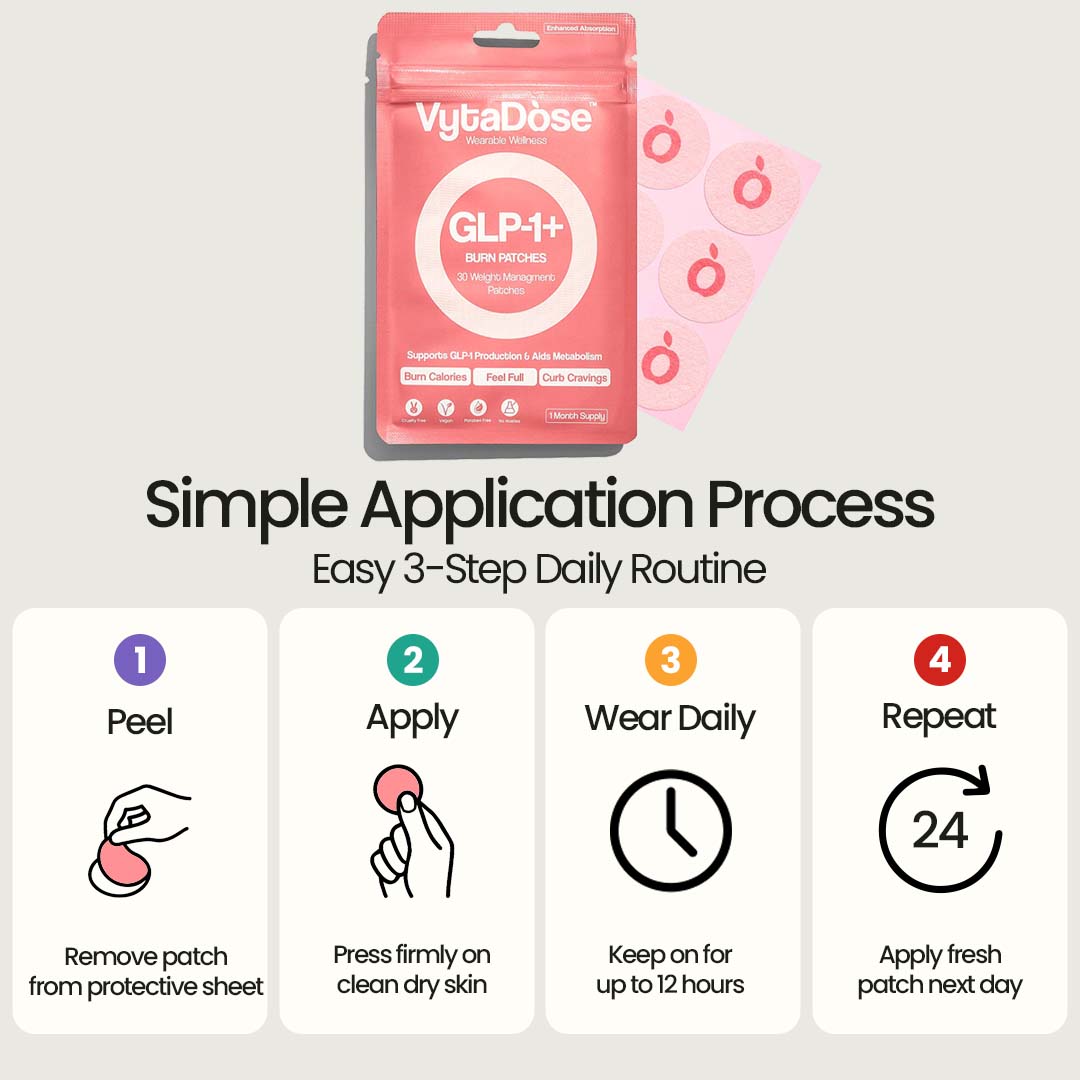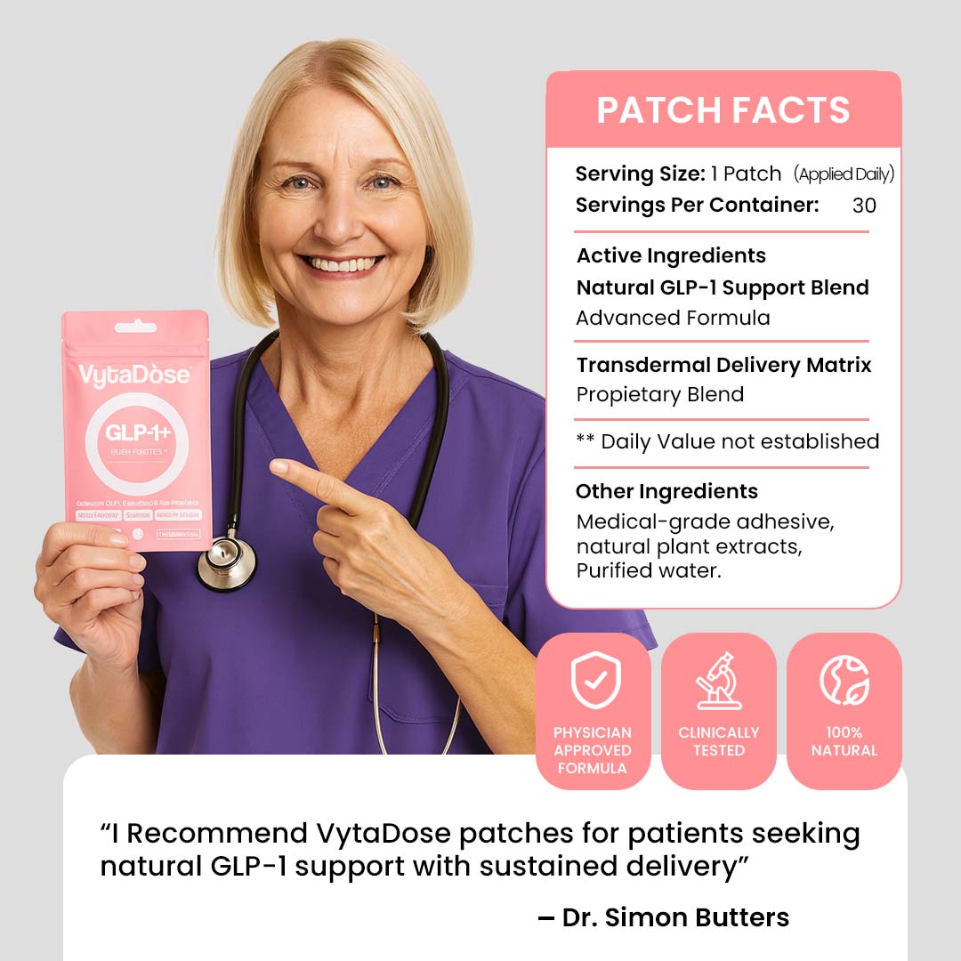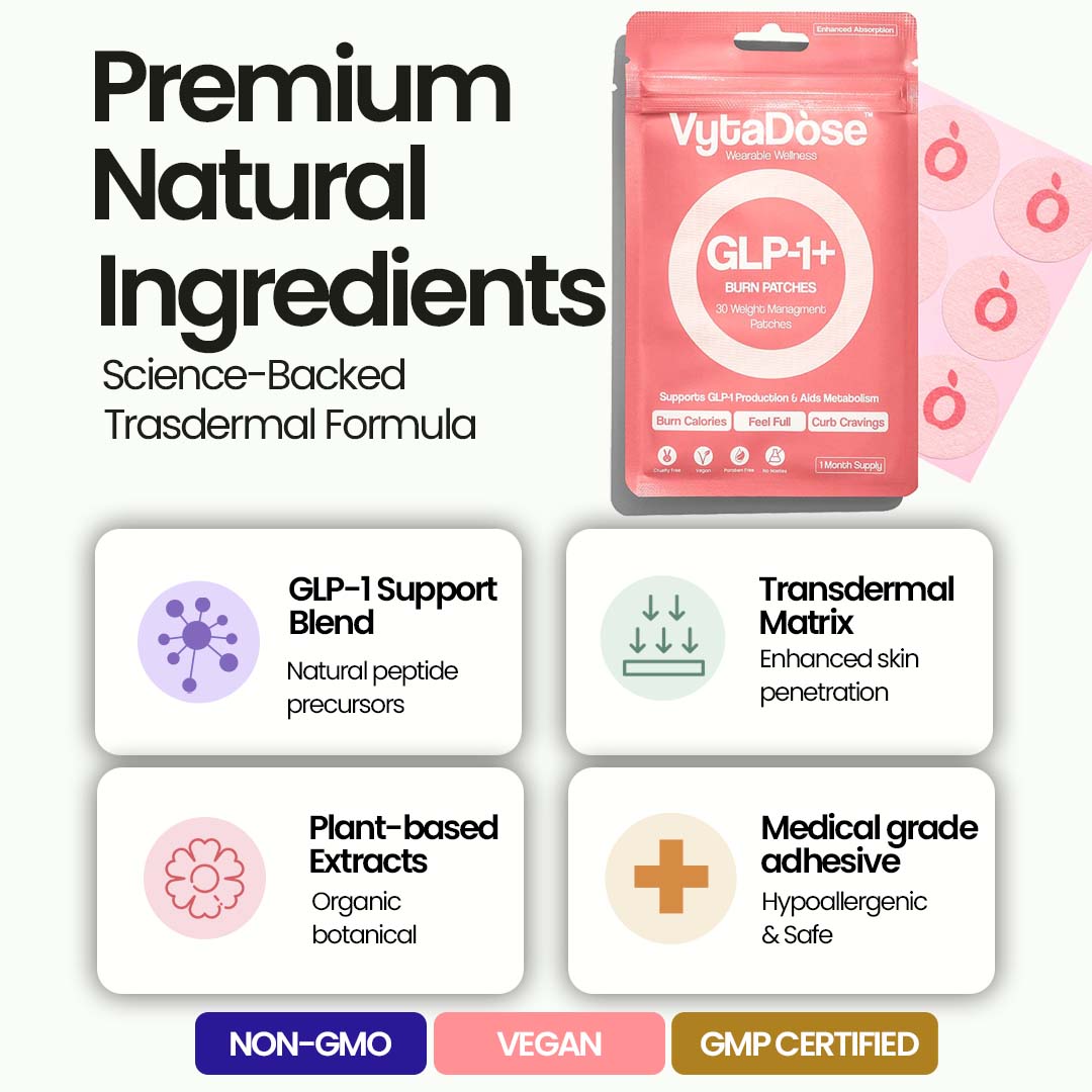 IMPORTANT DISCLAIMER: Vytadose GLP-1+ Patches contain natural botanical ingredients, including Berberine Extract, Garcinia Cambogia, Cinnamon Extract, and Chromium, that research suggests may support the body's natural wellness and satiety pathways as part of a healthy lifestyle with proper diet and exercise. VytaDose  GLP-1+ patches DO NOT contain synthetic hormones, or any receptor agonist drugs. They are not pharmaceutical medications or intended to replace prescription treatments.